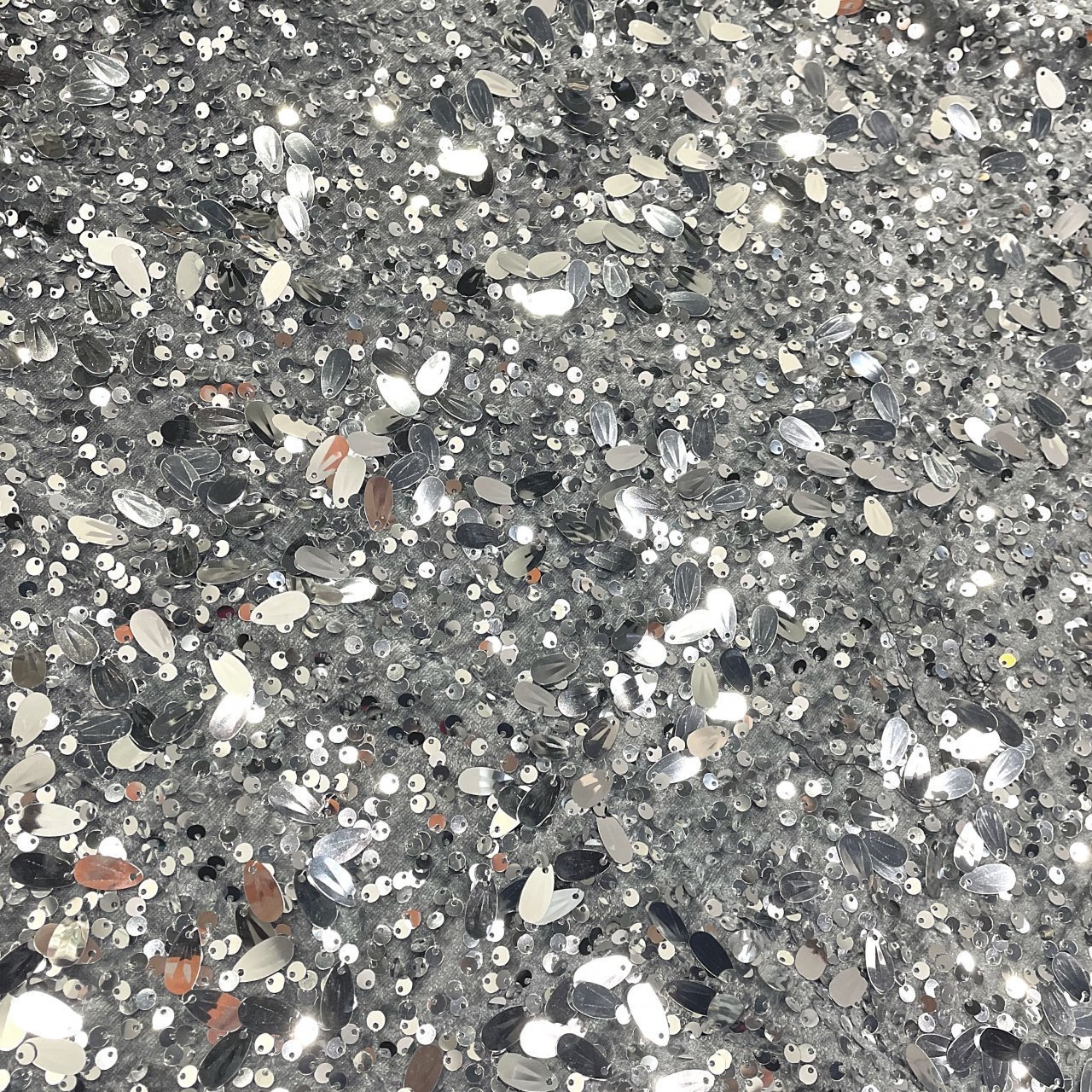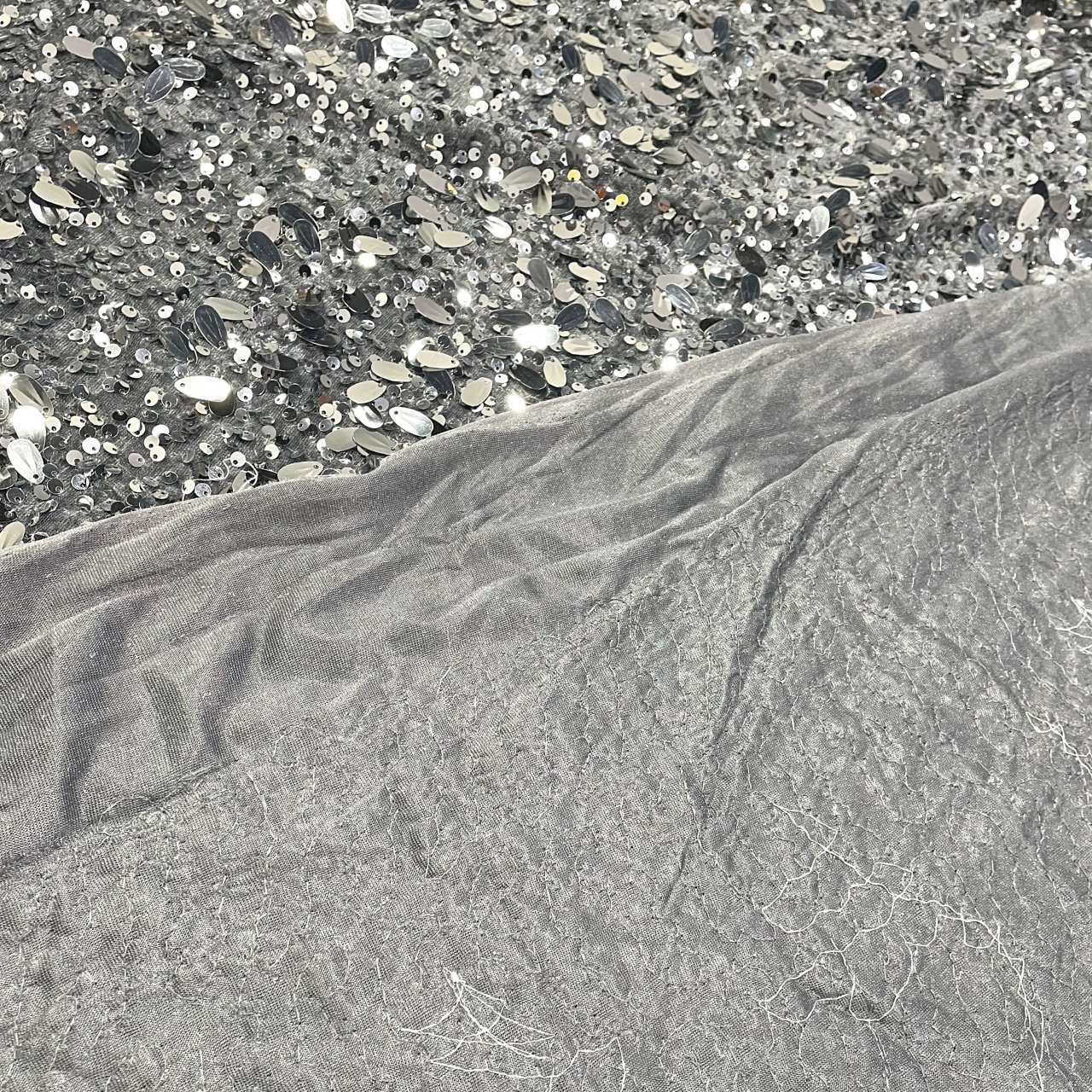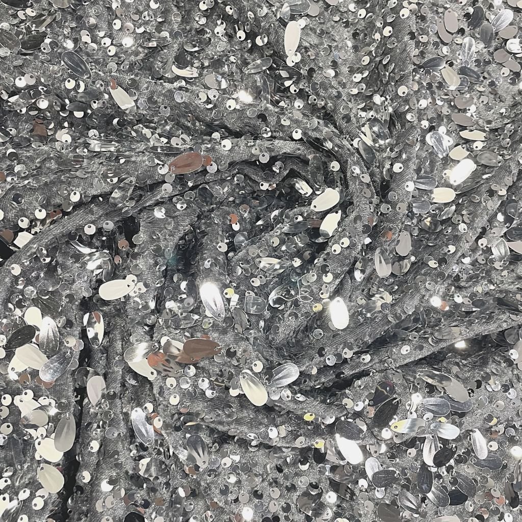 Тонкий стрейчевый бархат расшит пайетками и по всему полотну. Размер каждой пайетки 6 мм и плюс по всему полотну добавлены пайетки в виде капли, которые придают ткани дополнительный блеск при каждом движении. Великолепная ткань для создания цельного вечернего образа, или отдельных фрагментов изделия, которые придадут ему легкий шик и необычность.